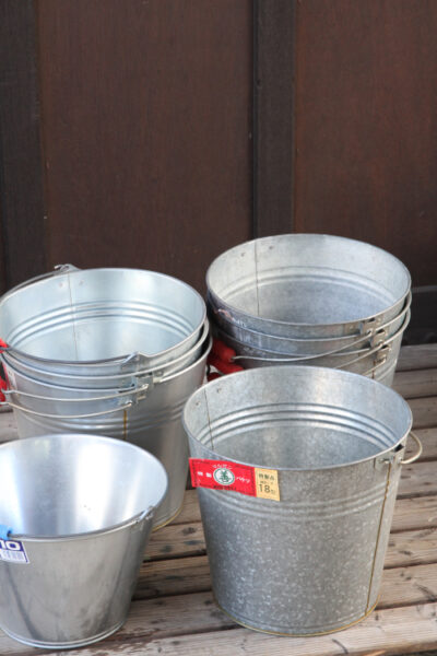 新品のブリキのバケツ 500円、1,000円。