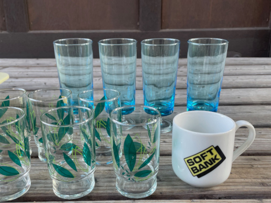 緑の葉っぱのグラスはアデリア! 昔のSOFTBNKロゴのマグも良いですね。