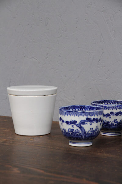 シンプルな陶器の蓋もの(660円)、絵柄も可愛く、少し大きめのサイズが使い良い印判のお猪口(1,650円)