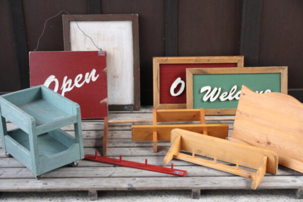 キャスター付道具入れ 1,500円、レシピスタンド 1,500円、棚500円、1,000円 などなどの木製品もたくさん!