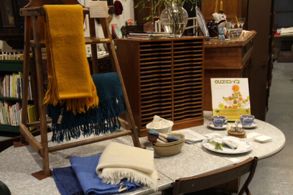 手紡ぎ、手染め、手織りのマフラーやキッチンや玄関におすすめのラグも入荷しています!